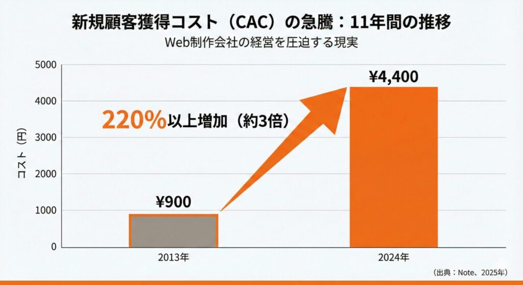 3つの危機に加えて、Web制作会社の経営を圧迫するもう一つの要因があります。新規顧客獲得コスト(CAC:Customer Acquisition Cost)の急速な上昇です。