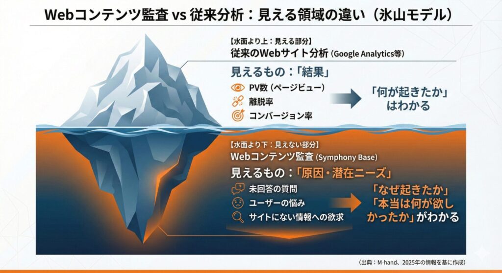 Google Analyticsでわかることは、どのページが見られたか、ユーザーがどこから来たか、どのページで離脱したか、コンバージョン率はどれくらいかといった「結果」です。しかし、なぜユーザーは離脱したのか、ユーザーが本当に知りたかった情報は何か、サイトにない情報を求めていたユーザーはどれくらいいたか、「存在しない機能」へのニーズはあるか、といった「原因」や「潜在ニーズ」までは見えません(出典:M-hand「Webサイトのリニューアルに役立つ『顧客アンケート』のすすめ」2025年4月20日)。