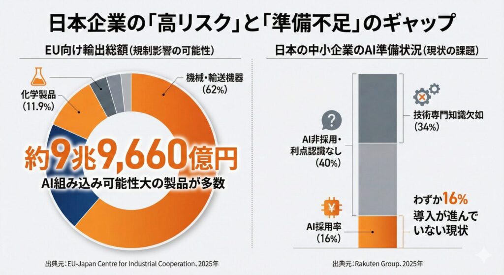 実際、2024年の日本からEUへの輸出総額は約9兆9,660億円にのぼります。主要輸出品目である機械・輸送機器(62%)や化学製品(11.9%)の中には、AIが組み込まれた製品も少なくありません。