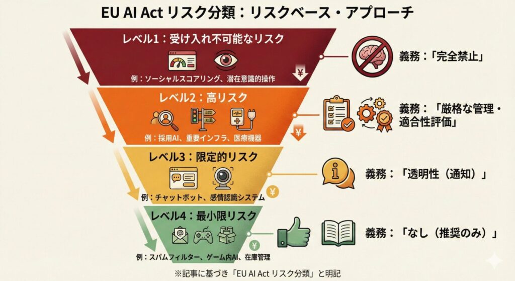 これらのAIは、EU AI Actにおいて異なる「リスクレベル」に分類され、それぞれ異なる規制要件が課されます。