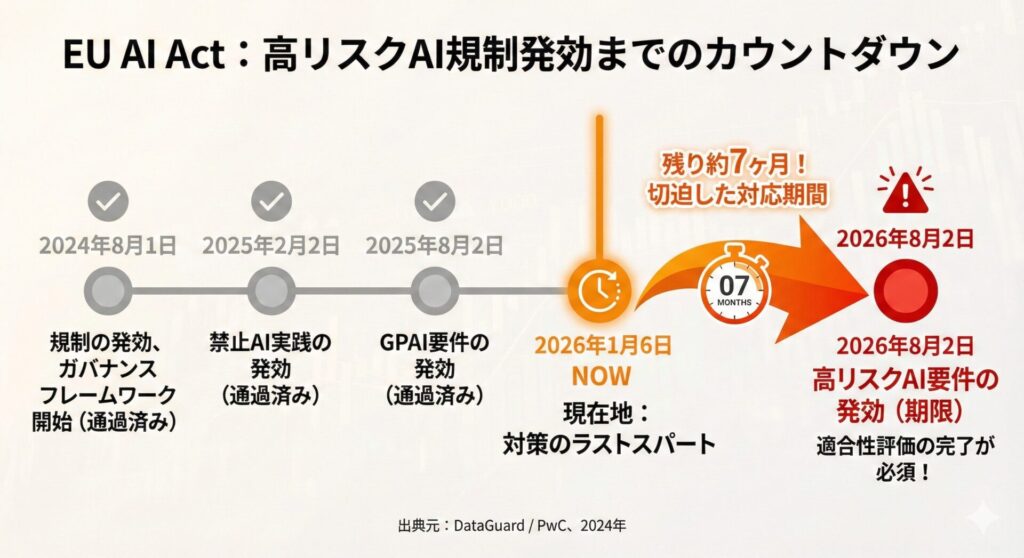 (出典:DataGuard “EU AI Act Timeline: Key Compliance Dates & Deadlines” / PwC “The EU AI Act: Compliance and transformation” 2024年12月)