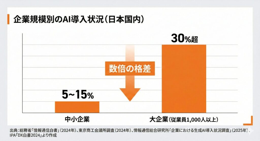 実際、中小企業のAI導入率は5〜15%程度にとどまっています(出典:総務省「情報通信白書」2024年、東京商工会議所調査2024年、情報通信総合研究所「企業における生成AI導入状況調査」2025年9月を統合した分析)。大企業(従業員1,000人以上)の導入率が30%を超えていることを考えると、数倍の格差が存在するのです(出典:IPA「DX白書2024」)。