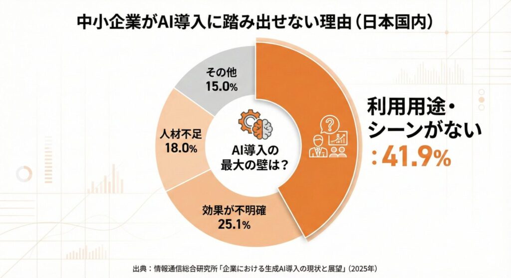 中小企業がAI導入に踏み出せない理由として、最も多く挙げられるのが「利用用途・シーンがない」で41.9%です(出典:情報通信総合研究所「企業における生成AI導入の現状と展望」2025年9月、従業員300人未満の企業を対象)。
