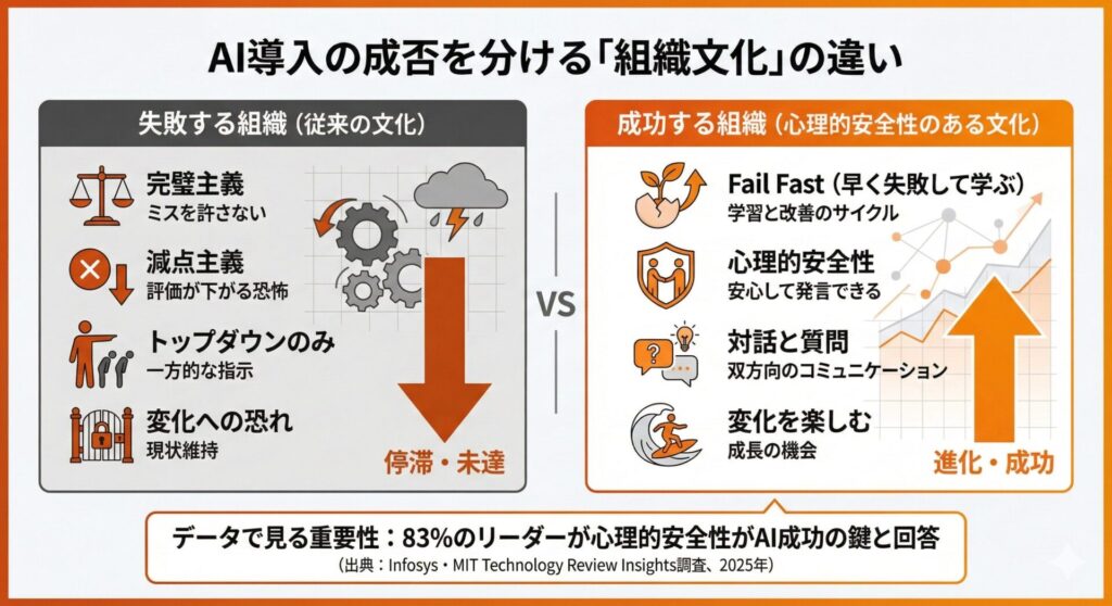 リスクを過度に恐れ、完璧を求める文化では、AIの実験的な活用は進みません。