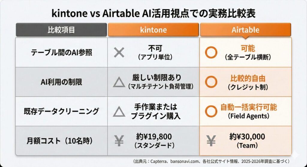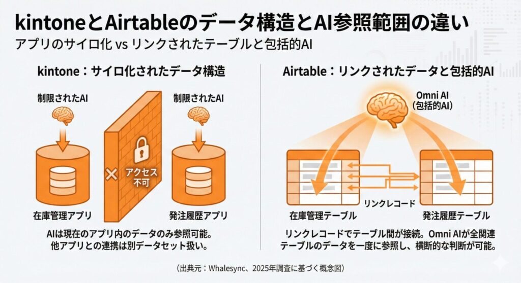 kintoneはアプリ単位の分離設計のため、AIが現在のアプリのデータのみを参照します。Airtableは全テーブルを一度に参照可能で、複数テーブルにまたがる判断ができます。