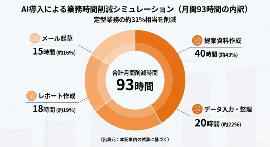 この数値は、営業10人+事務2人の中小企業における定型業務時間(月間約300時間と想定)に対し、AI活用により月93時間の削減が見込める試算に基づいています。93時間÷300時間=約31%となり、これを「30%削減」と表現しています。具体的な削減効果の試算は、本記事の「年間時間削減のシミュレーション」セクションで詳しく解説します。