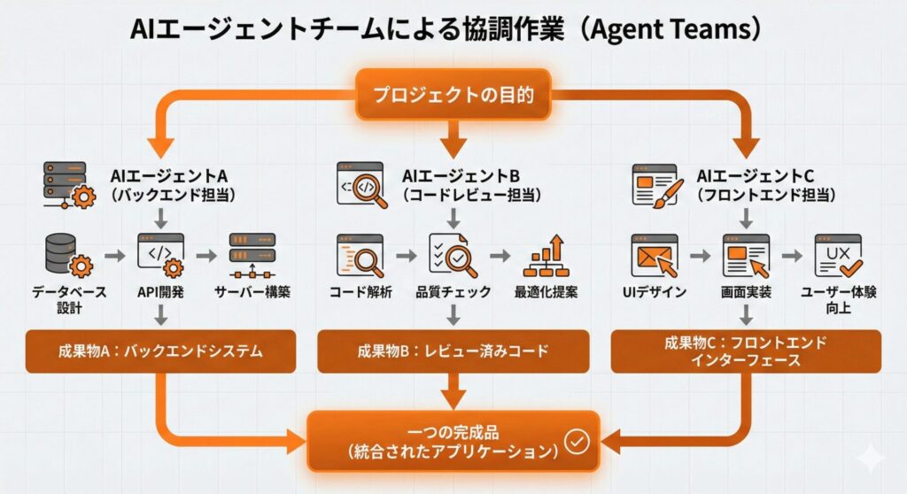 もう1つの大きな変化は「Agent Teams」機能です。これは、複数のAIエージェントが役割分担をしながら、並列で作業を進める機能です(出典: TechCrunch「Anthropic releases Opus 4.6 with new ‘agent teams’」、2026年2月4日)。