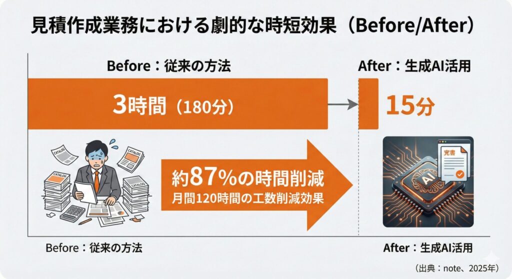 従業員10名規模の町工場での事例では、見積作成時間が従来の3時間から約15分に短縮(約87%削減)され、月間約120時間の工数削減、月間約30万円相当の人件費削減効果があったと報告されています(出典: note「町工場のAI活用」、2025年)。