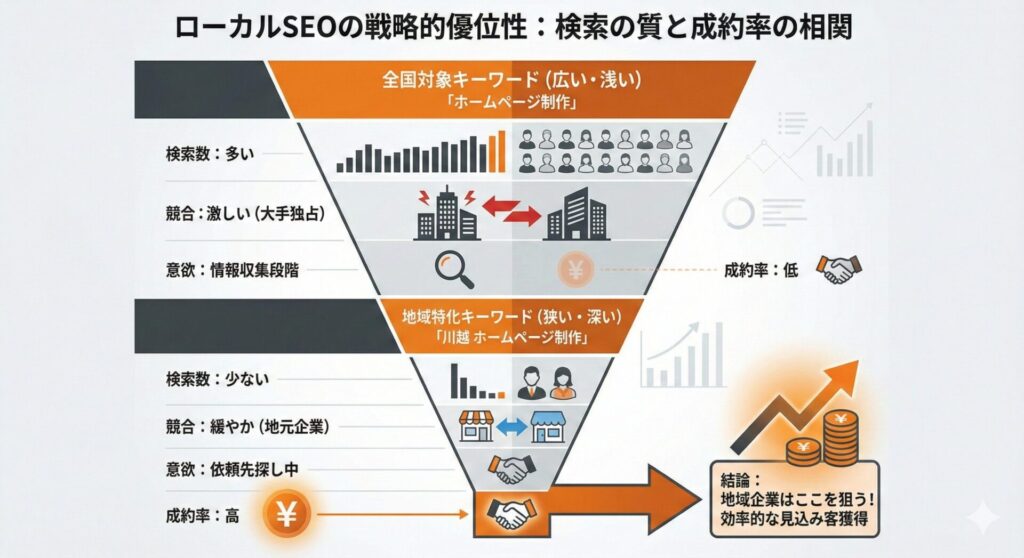 ローカルSEOが効果的な理由は、検索意図の明確さにあります。「ホームページ制作」という単純なキーワードで検索するユーザーは、情報収集段階にある可能性が高いです。一方、「川越 ホームページ制作」と検索するユーザーは、川越エリアで実際にサービスを探している、つまり購買意欲が高い状態にあります。