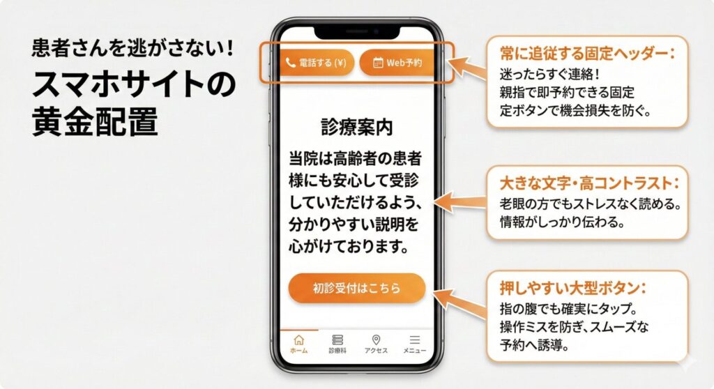 常に表示されるヘッダーに主要導線を配置 画面上部に「電話」「Web予約」「アクセス」のボタンを固定表示し、どのページを見ていても1タップで行動できるようにします。