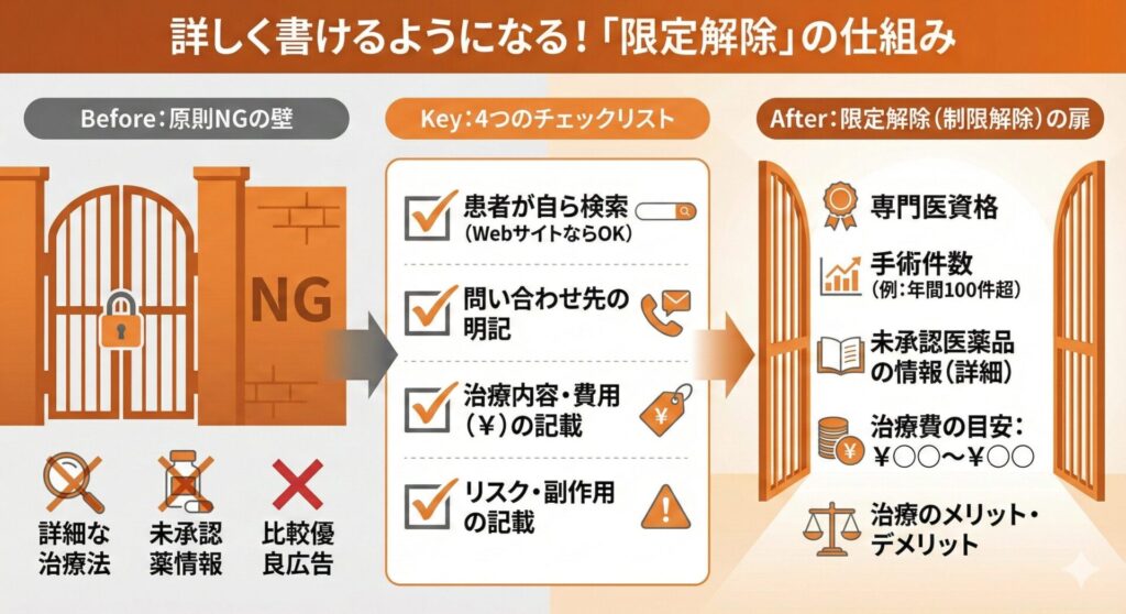 医療広告ガイドラインの遵守と限定解除の理解 表現の制約を理解し、限定解除要件を満たした適切なコンテンツ制作が必須です。