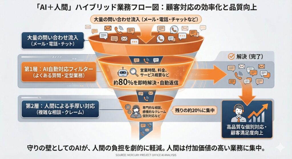 このような環境で生成AIが力を発揮します。AIは疲れを知らず、24時間働き続けることができます。定型的な作業を任せることで、人間は「人間にしかできない仕事」に集中できるようになるのです。